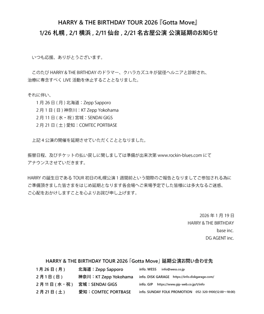 HARRY & THE BIRTHDAY TOUR 2026 「Gotta Move」1/26 札幌, 2/1横浜, 2/11仙台, 2/21名古屋公演 公演延期のお知らせ